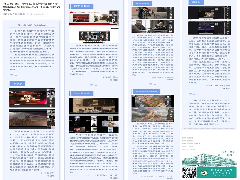 我院组织学生观看历史文献纪录片《白山黑水铸英魂》,在疫情防控期间丰富大学生文化生活与夯实大学生思想政治工作实效紧密结合,引导师生正确面对疫情,切实做到停课不停学。