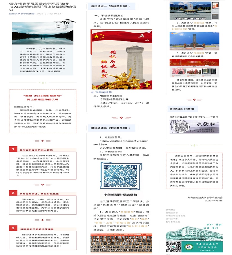 梨花风起正清明,又是一年追思时。清明节是中华民族的传统节日,是祭奠逝者、缅怀英烈、追思故人的重要时节。而今我省疫情防控形势仍非常严峻,在清明节来临之际,农学院团委倡议延农学子积极参与“网上祭英烈”活动。
