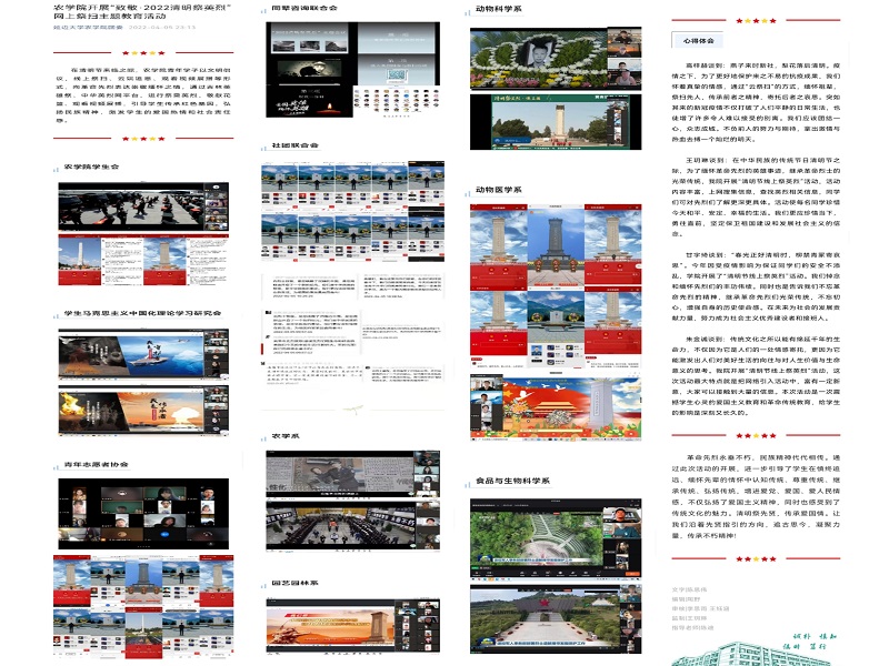 在清明节来临之际,农学院青年学子以文明倡议,线上祭扫、云端追思、观看视频展播等形式,向革命先烈表达崇敬缅怀之情,通过吉林英雄祭、中华英烈网平台,进行祭奠英烈、敬献花篮、观看视频展播,引导学生传承红色基因,弘扬民族精神,激发学生的爱国热情和社会责任感。