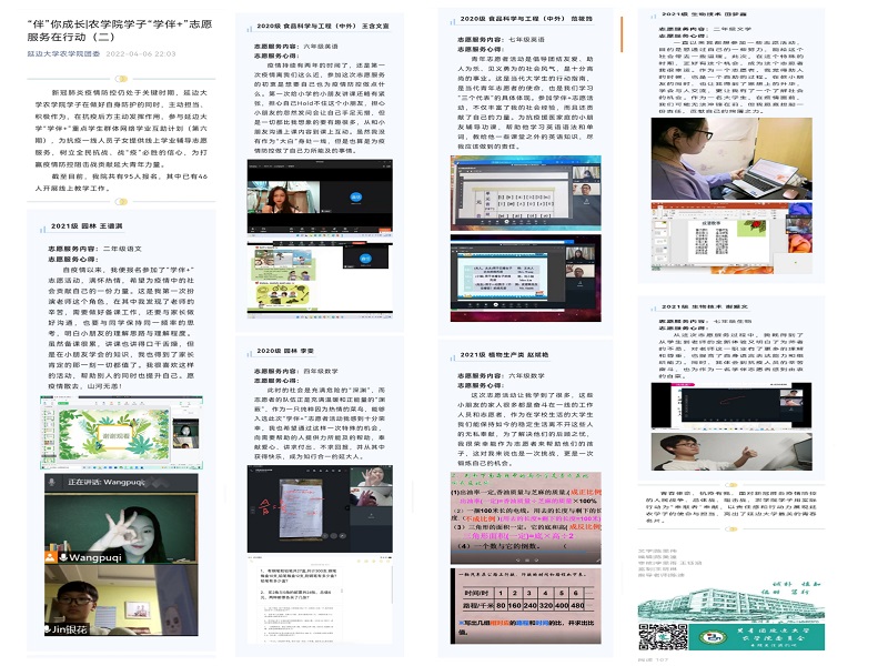 新冠肺炎疫情防控仍处于关键时期,延边大学农学院学子在做好自身防护的同时,主动担当、积极作为,在抗疫后方主动发挥作用,参与延边大学“学伴+”重点学生群体网络学业互助计划(第六期),为抗疫一线人员子女提供线上学业辅导志愿服务,树立全民抗战、战“疫”必胜的信心,为打赢疫情防控阻击战贡献延大青年力量。