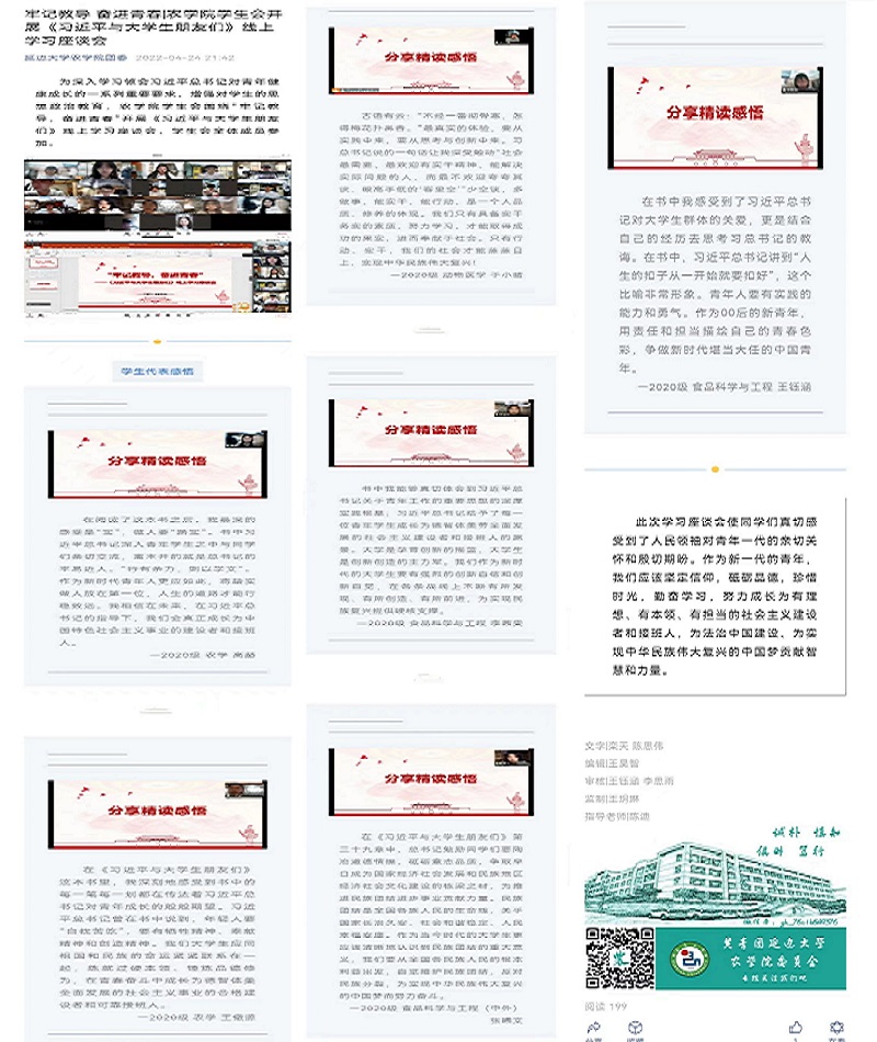 为深入学习领会习近平总书记对青年健康成长的一系列重要要求,增强对学生的思想政治教育,农学院学生会围绕“牢记教导,奋进青春”开展《习近平与大学生朋友们》线上学习座谈会,学生会全体成员参加。