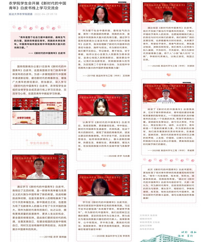国务院新闻办公室21日发布《新时代的中国青年》白皮书,这是我国首次专门就青年群体发布的白皮书。为进一步展现新时代中国青年奋进新征程、建功新时代的青春担当,增强广大青年的责任意识、担当意识,深入学习《新时代的中国青年》白皮书,农学院学生会组织全体学生会成员进行线上学习交流会,交流学习心得,在团员青年中掀起学习热潮。